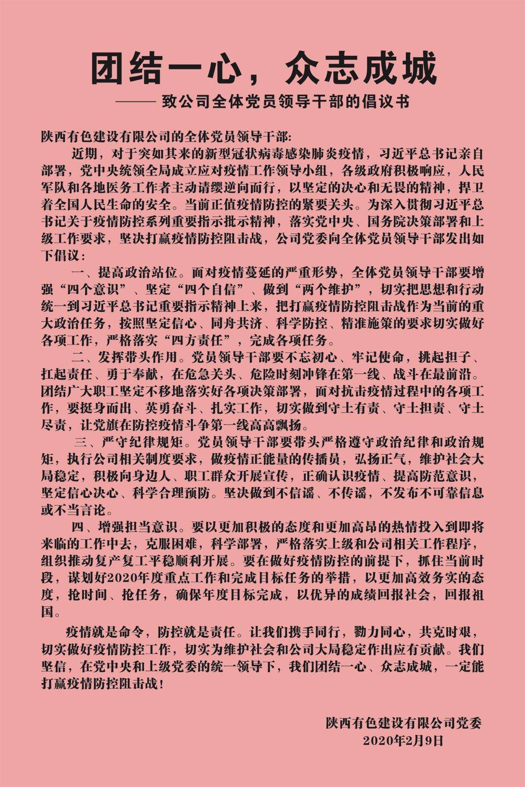 疫情就是命令、防控就是責任。近日,公司黨委發布了致公司全體黨員領導干部的倡議書,號召全體黨員干部切實提高政治站位,發揮帶頭作用,嚴守紀律規矩,增強擔當意識,為公司疫情防控工作和公司穩定大局作出貢獻。