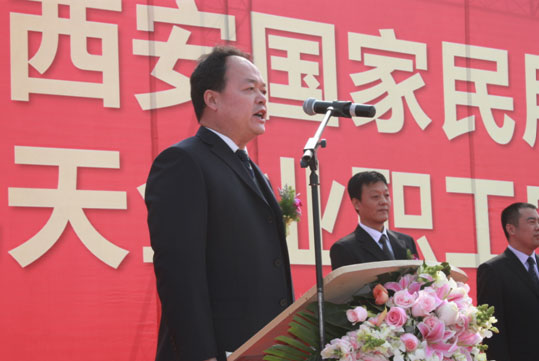 該工程總承包單位陜西有色建設有限公司董事長劉俊青在儀式上講話。他鄭重承諾,公司將把該工程作為公司的重點信譽工程,嚴格按照圖紙設計要求組織施工,選派公司精干團隊,確保工程質量、工期和施工安全,保質保量完成各項施工任務,讓社會滿意、讓建設單位滿意、讓開發商滿意。最后,由西安國家民用航天產業基地管委會副主任李巖宣布項目奠基開工,并與參加儀式的諸位領導為項目奠基培土。